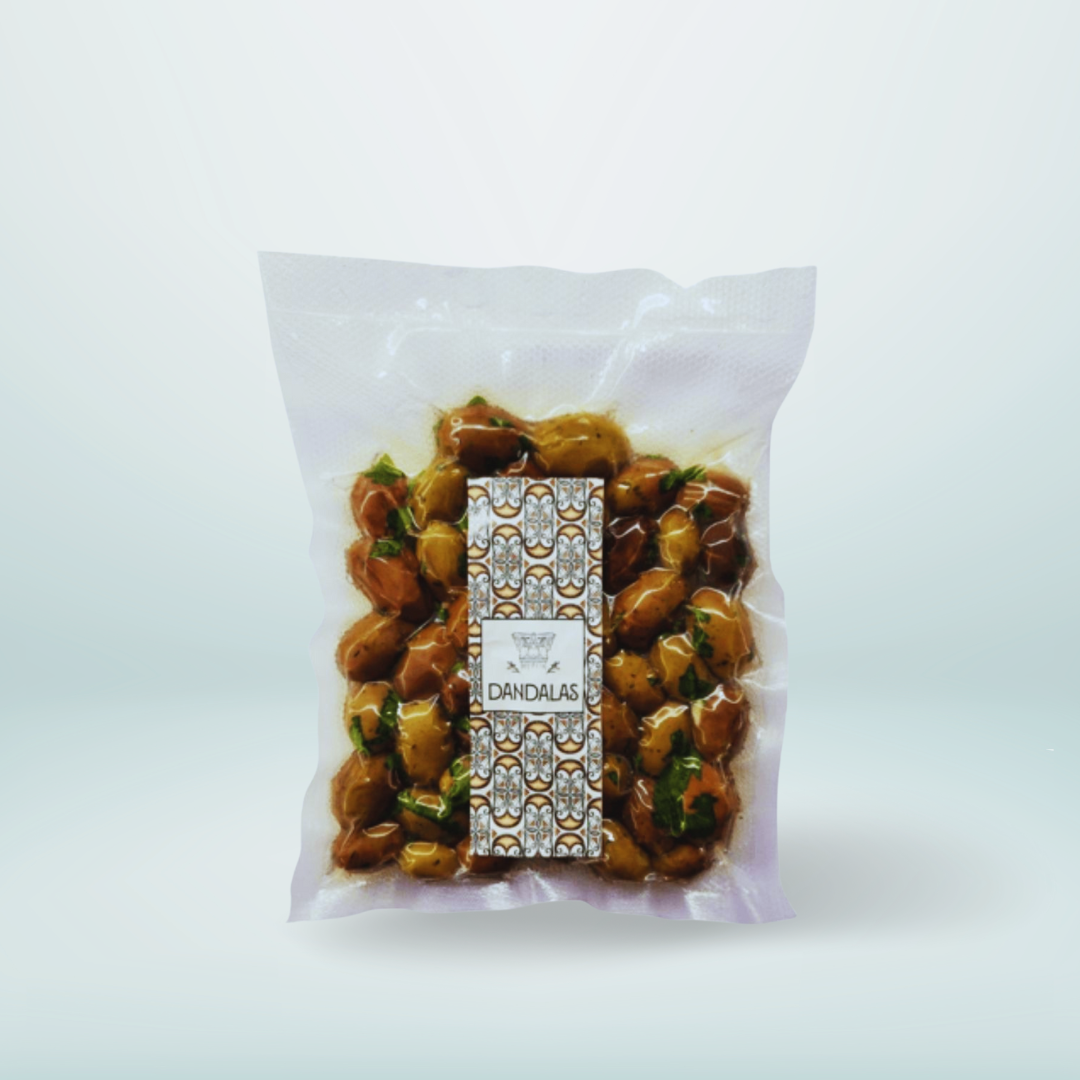 Aydın bölgesinde yetiştirilen Kalamata cinsi çizik yeşil zeytin. Sarımsak, maydonoz ve kuru nane ile hazırlanan özel sos ile birlikte 250 gr vakumlu paketlerde kullanıma sunulmaktadır. Zeytinlerimiz herhangi bir katkı maddesi içermez ve herhangi bir kimyasal işlemden geçirilmemiştir. Buz dolabında saklanması tavsiye edilir.